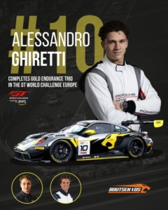 • Boutsen VDS completa la formazione in Gold Cup nel GT World Endurance Cup                                                                                                                                                        La squadra belga di Olivia Boutsen e Oliver Lainè (Boutsen VDS) completano la formazione sulla Porsche 911 GT3 R Evo #10 in Gold Cup nel GT World Challenge Europe Powered by AWS,annunciando il24 pilota francese Alessandro Ghiretti campione in carica nella Porsche Supercup e titoli nella Porsche Carrera Cup France e Asia nel 2024.Ghiretti si unirà ai già confermati piloti;lo svedese Robin Knutsson e il belga Gilles Magnus.Ghiretti aveva già partecipato nel GT World nel 2025 nell’ultimo round Endurance a Barcelona con la Porsche 911 GT3R (Schumacher CLRT) in coppia con Ayancan Güven e Larry ten Voorde in sostituzione  di Laurin Heinrich. L’equipaggio in PRO con la Porsche #10 era già stato confermato un mese fa con Dorian Boccolacci,Alessio Picariello e Morris Schunig.Nella Sprint Cup Dorian Boccolacci  condividerà la Porsche con gli stessi piloti a secondo della loro disponibilità.                                                                                                        Testo Roberto Beretta-Foto Boutsen VDS