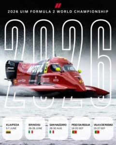 Motonautica :ufficializzato il calendario dell’Europeo di Formula 2. UIM Union Internationale Motonautica ha ufficializzato il calendario 2026 del Formula 2 World Championship che si svolgerà in cinque gare.Il primo rond si svolgerà a Klãipèda in Lithuania dal 5/7 giugno,IN italia si svolgeranno 2 eventi a Brindisi il secondo round dal 26/28 giugno,terzo round a San Nazzaro dal 20/30 agosto.Anche in Portogallo si svolgeranno 2 eventi,il quarto round a Peso da Regua dal 18/20 settembre la settimana successiva il quinto round a Vila Velha de Rodão da l 25/27 settembre.In seguito verranno annunciti i team partecipanti. Testo Roberto BerettaFoto UIM